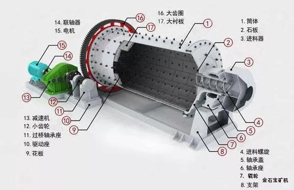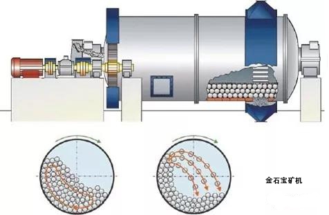 工作时,给矿部将矿石送入筒体后,筒体会按规定的转速绕水平轴线回转,同时矿石通过离心力和磨矿介质的摩擦力,做自由泻落或抛落运动,从而受到冲击和磨剥作用而被粉碎,磨碎以后的产品经排矿部排出。
