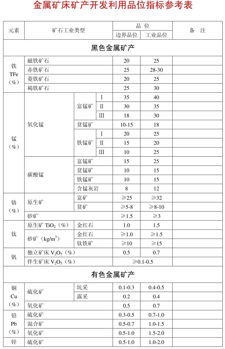 金属矿床矿产开发利用品位指标表